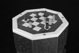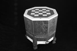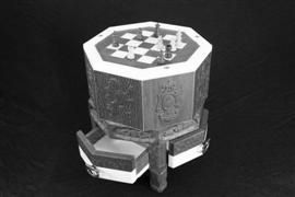 Each Stickman Checkmate (No. 13) Puzzlebox has been quality hand-crafted from the finest holly, mahogany and leopardwood and comes with its own set of hand-carved travel-sized chess pieces. The box is richly decorated with intricate carvings of royal lions, noble crests and filigrees. It has an inlaid chessboard, sculpted feet, and attractive brass screw and handle accents. Chess pieces attach magnetically to the top of this box and will individually move across the board as the top portion of the box is rotated in various directions and degrees. The box comes with two hidden compartments that will unlock only after all pieces have been mechanically maneuvered into a checkmate for either the white or black side.