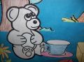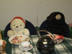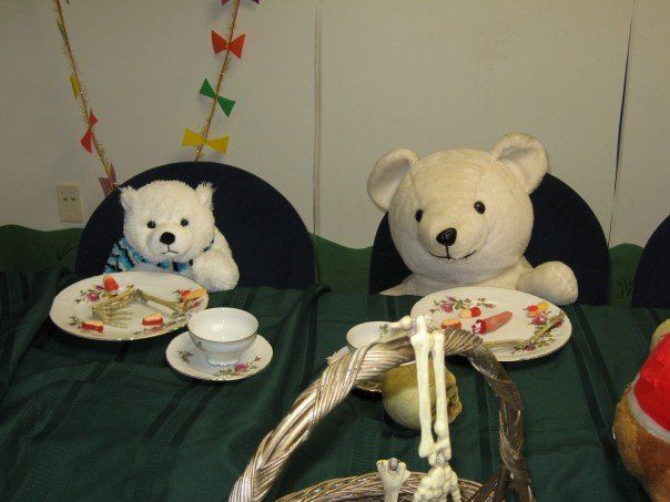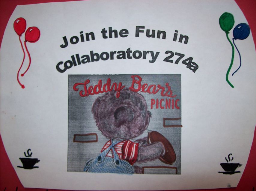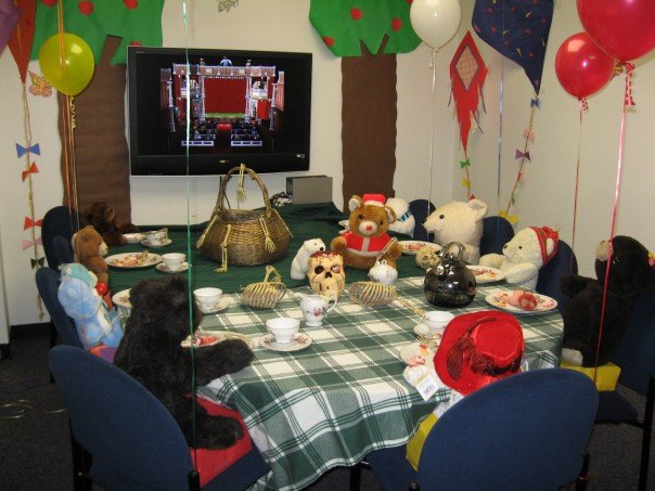 As shown in the pictures above, the large monitor is the center of the room, and as such, we felt that it needed something on the screen. We also wanted to have the "Teddy Bears' Picnic" song being played in the background. We were very fortunate in finding this short film, which was set to loop for the entire two hours. The film was created by Britannica Dreams Productions, with music performed by Gilbert Russell.