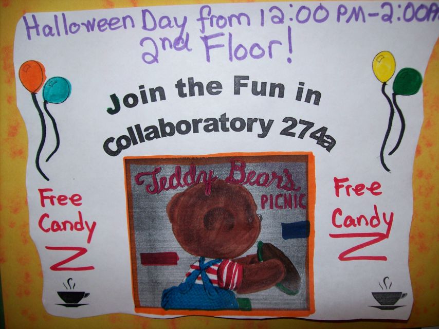We took collaboratory 274a , decorated it and handed out candy during the hours of noon to 2:00pm. Below are examples of the signs we printed, colored, and hung at our desks or offices advertising the event: